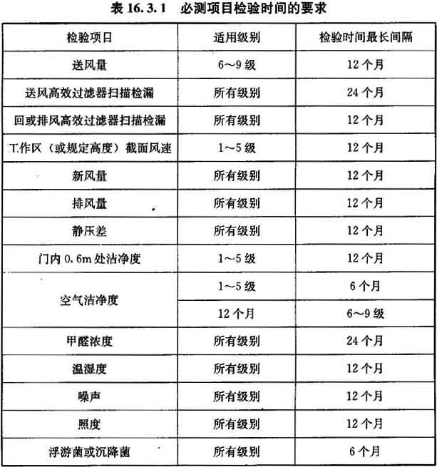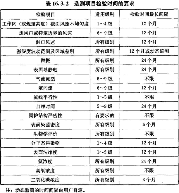 16.3.2 在工程驗收后為確認潔凈室的選測項目符合要求的日常檢驗(不含臨時抽測)周期可按表16.3.2確定。
