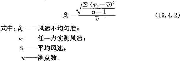 16.4.2 當需對室內(nèi)單向流品質(zhì)作細致確認時,可測工作區(qū)(或規(guī)定高度)截面風速不均勻度。風速不均勻度應按附錄E檢驗,并按下式計算,結(jié)果不應大于0.25。
