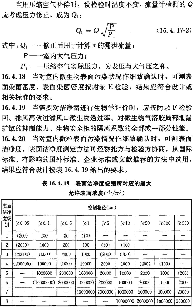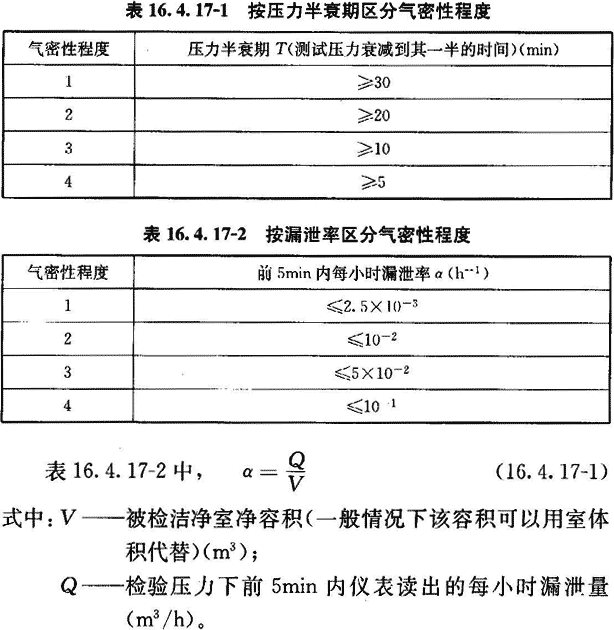 16.4.17 當對潔凈室的嚴密性有特殊要求時,可測其圍護結(jié)構(gòu)嚴密性。圍護結(jié)構(gòu)嚴密性按附錄G檢驗。檢驗結(jié)果應符合設計要求。當設計無明確要求時,可在以下兩表的任何一種評定方法中任選一種方法,兩表中最大測試壓力設定為500Pa。