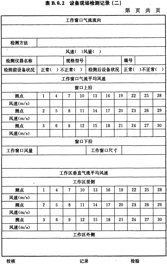 B.0.2 工作窗口氣流流向情況、風(fēng)速(或風(fēng)量)的檢測應(yīng)按表B.0.2進行記錄。