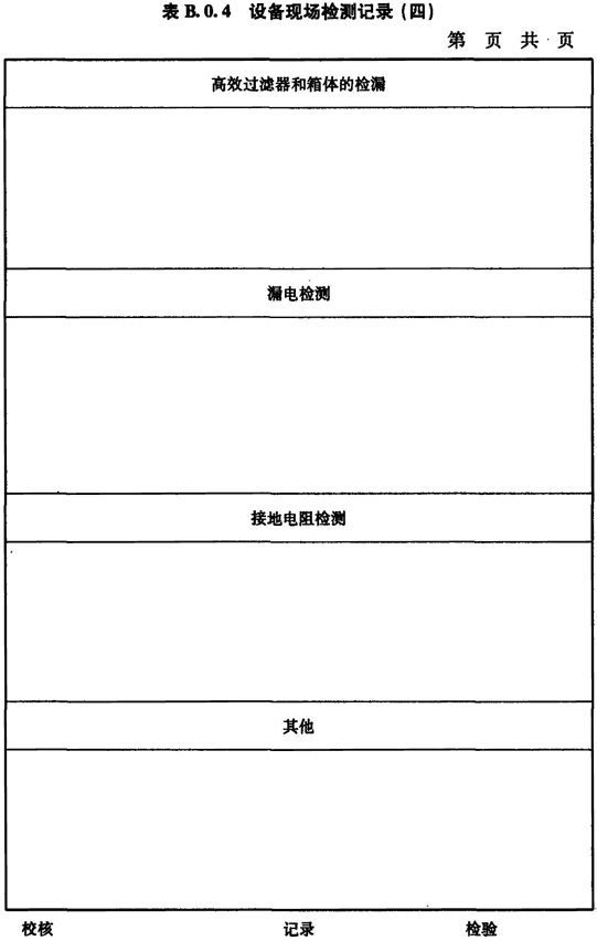 B.0.4 排風(fēng)高效過濾器的檢漏、生物安全柜箱體的檢漏、生物安全柜漏電檢測、接地電阻檢測等的檢測應(yīng)按表B.0.4進行記錄。
