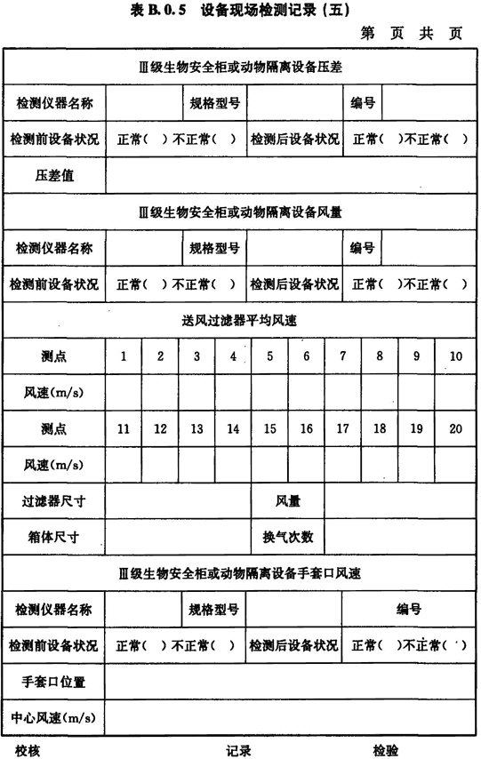 B.0.5 Ⅲ級生物安全柜或動物隔離設(shè)備的壓差、風(fēng)量、手套口風(fēng)速的檢測應(yīng)按表B.0.5進行記錄。