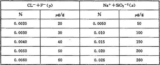 x——測(cè)得的(Na++SiO32-)離子含量<0.005%。